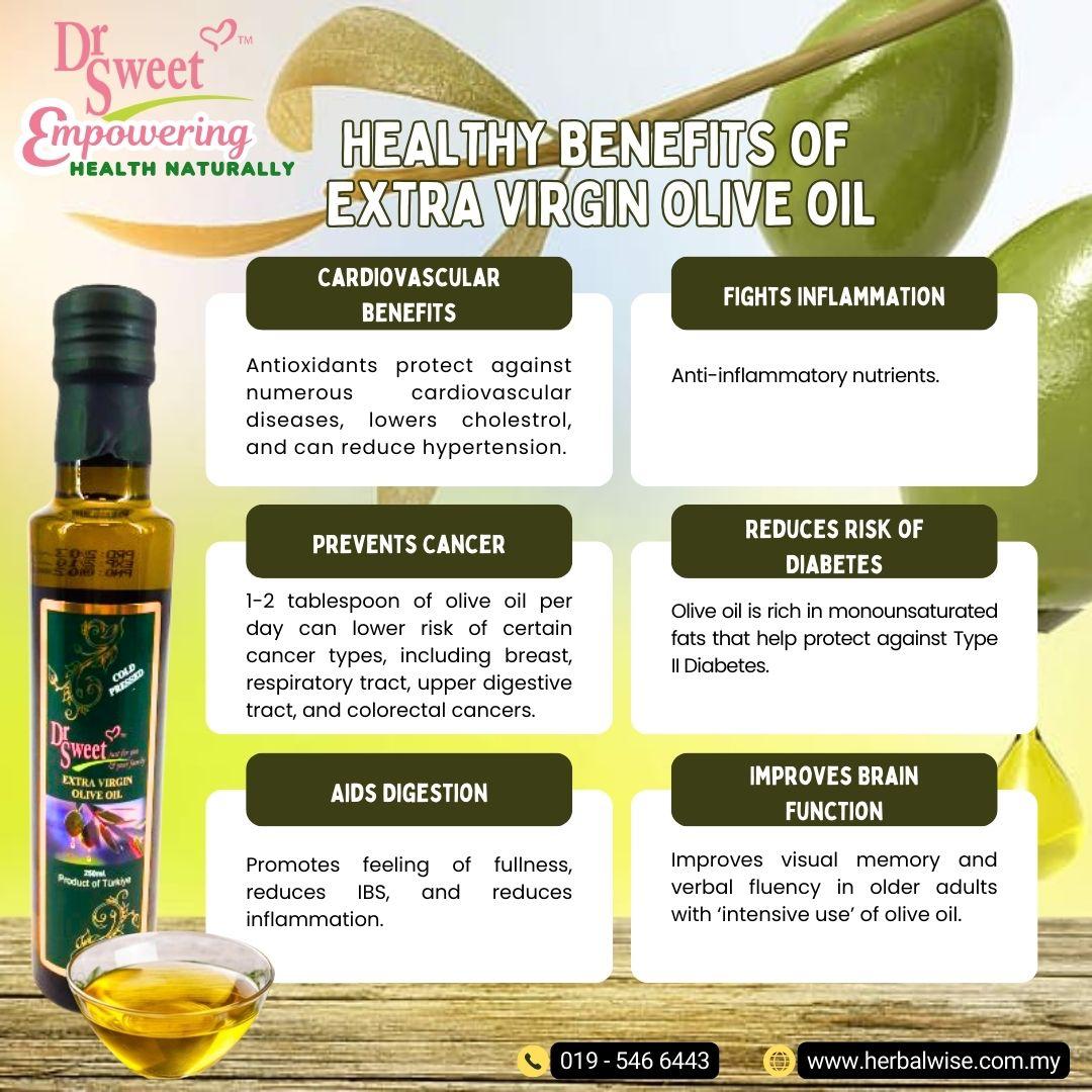 Dr. Sweet Extra Virgin Olive Oil is a healthy and tasty part of the Mediterranean diet. Made from the first olives of the season, it’s full of good fats and antioxidants that help with inflammation and disease prevention. It adds great flavor to salads, bread,