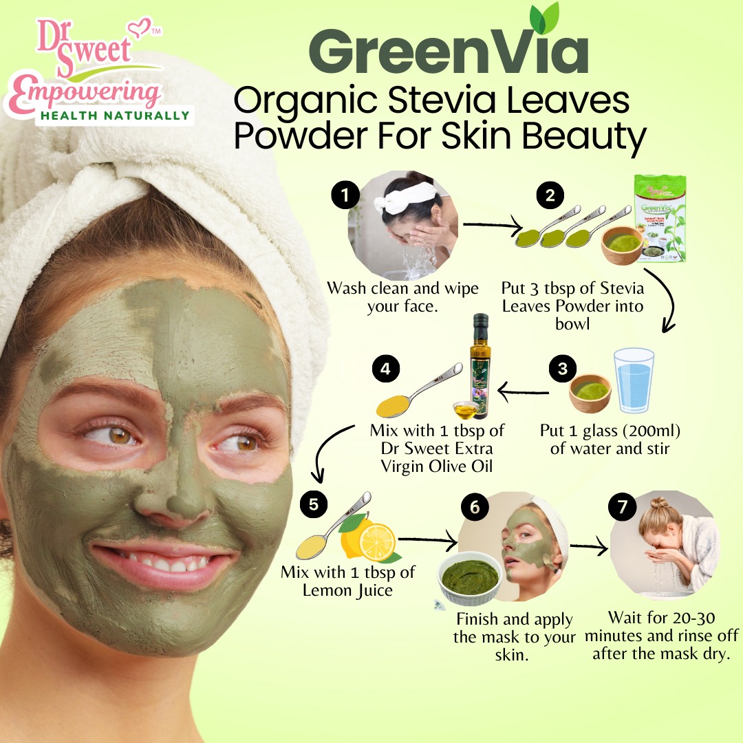 Face Masks: Campurkan serbuk daun stevia dengan bahan semula jadi seperti madu, yogurt, atau buah yang dihancurkan untuk membuat masker muka buatan sendiri. Sapukan campuran tersebut pada kulit yang bersih, biarkan selama 10-15 minit, kemudian bilas dengan air suam. Sifat antioksidan stevia dapat membantu menyuburkan dan menegangkan kulit