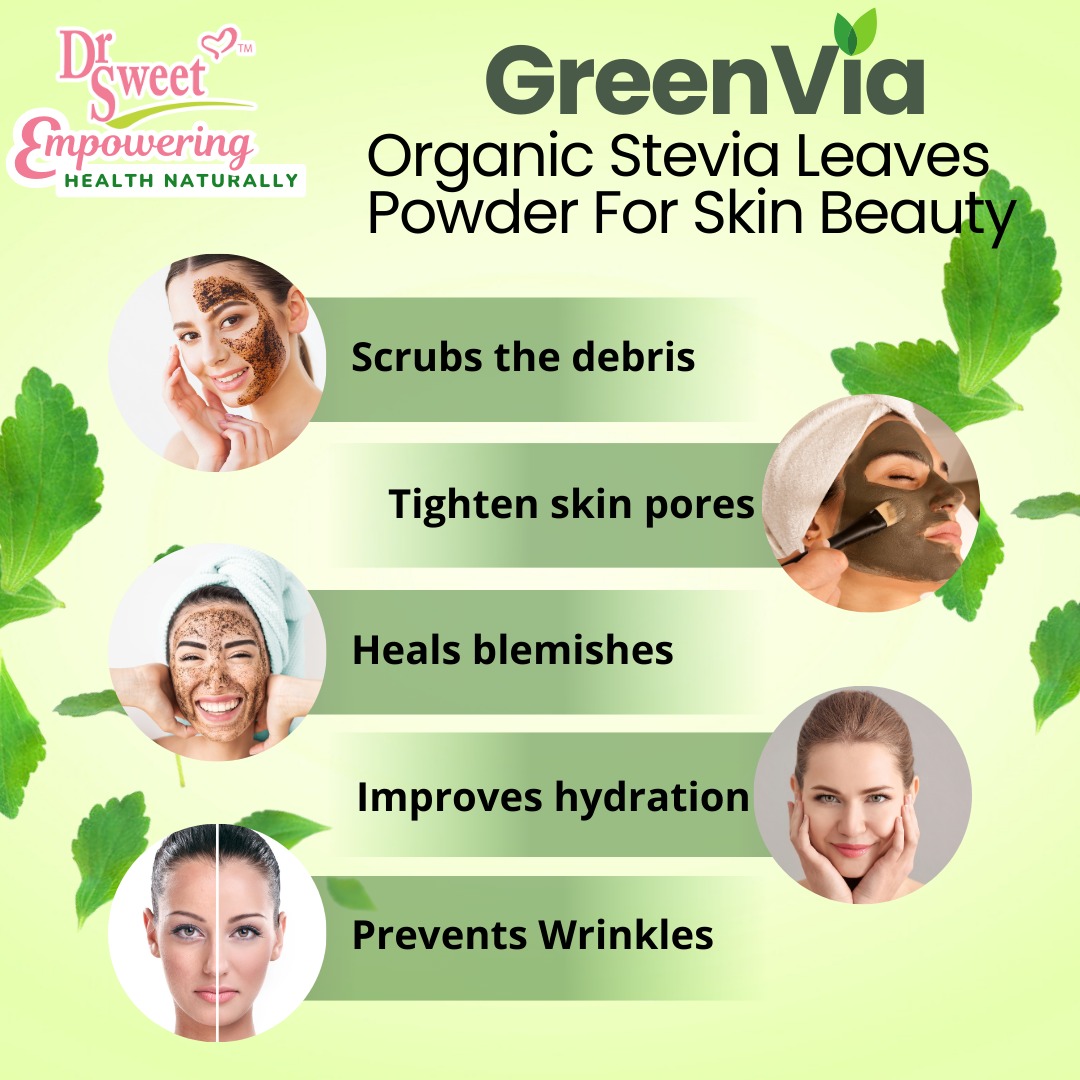 Scrubs: Campurkan serbuk daun stevia dengan eksfolian lembut seperti oat atau gula perang untuk membuat skrub DIY. Sapukan campuran tersebut secara perlahan pada kulit lembap dengan gerakan bulatan, kemudian bilas dengan air. Ini boleh membantu menghilangkan sel-sel kulit mati dan merangsang kulit yang lebih licin