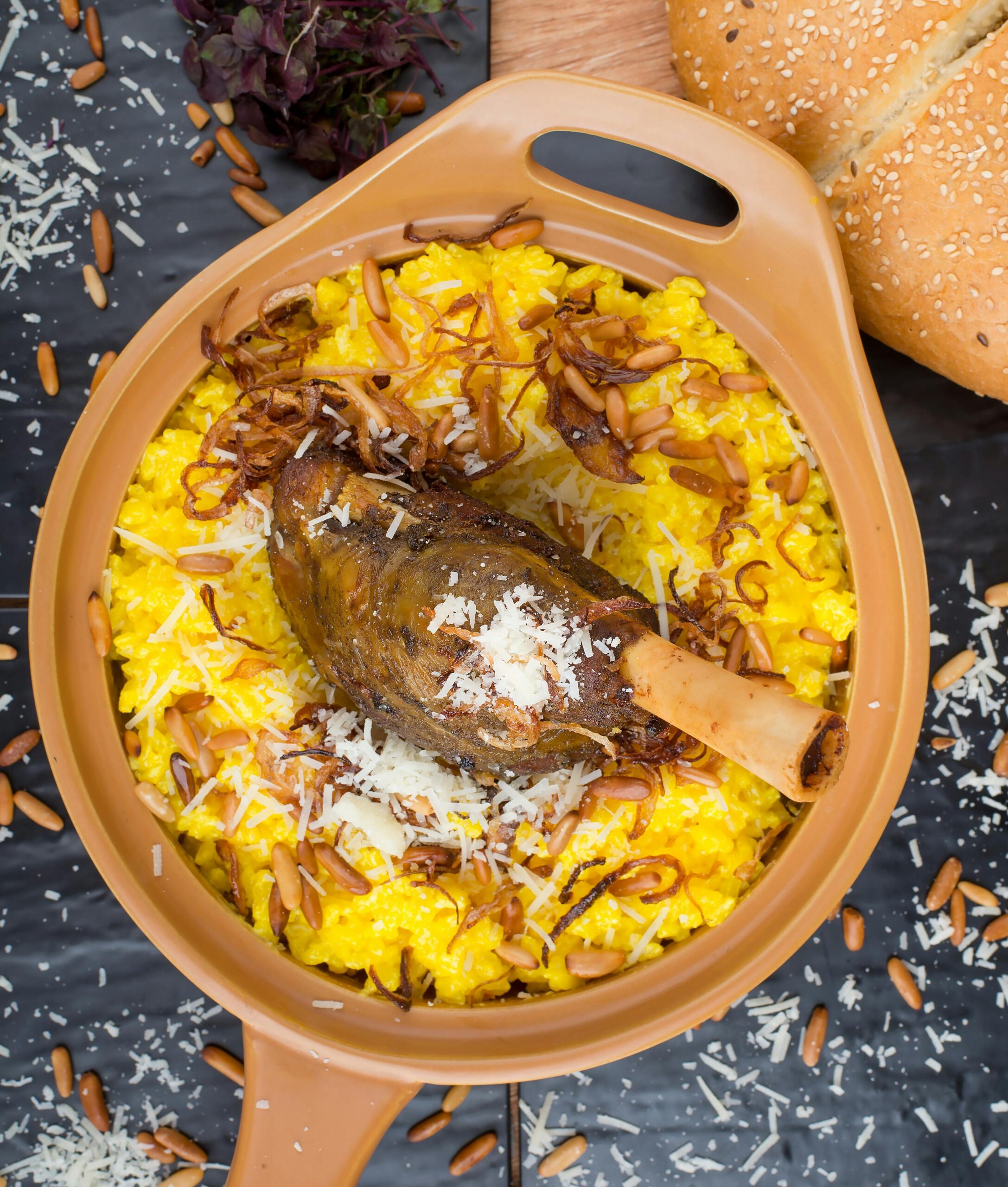 Rich In Spices, the lamb shank is full of Falling-off-the-bone Flavour, layered with fluffy rich saffron rice.